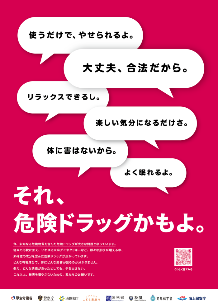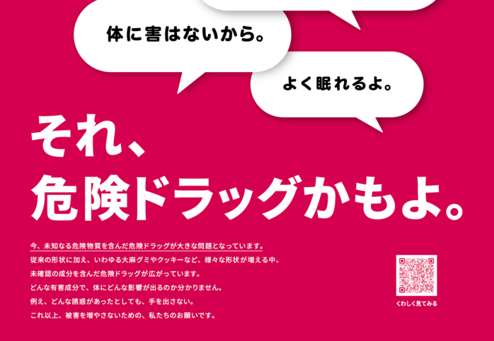 危険ドラッグは、使用がやめられなくなったり、死亡例を含む健康被害や異常行動を引き起こす場合があり、麻薬や覚醒剤等と同様に大変危険な薬物です。